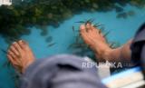 Warga memanfaatkan fasilitas ikan terapi di ruang edukasi anak di halaman Kantor Kelurahan Karet, Jakarta, Rabu (7/4). Ruang terbuka yang berkonsep kebun binatang mini (mini zoo) ini memiliki sejumlah koleksi hewan peliharaan seperti kelinci, burung dan ikan hias. Adanya mini zoo tersebut berfungsi sebagai ruang interaksi serta sarana edukasi bagi warga. (FOTO : Prayogi/Republika.)