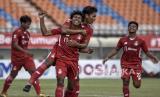 Sejumlah pemain Persik Kediri melakukan selebrasi usai mencetak gol ke gawang Persela Lamongan dalam pertandingan lanjutan Grup C Piala Menpora 2021 di Stadion Si Jalak Harupat, Kabupaten Bandung, Kamis (7/4). Pertandingan antara Persela Lamongan melawan Persik Kediri tersebut berakhir imbang dengan skor 2-2. Foto: Republika/Abdan Syakura (FOTO : REPUBLIKA/ABDAN SYAKURA)