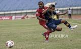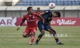 Bek Persik Kediri Andri Ibo (kiri) berebut bola dengan penyerang Persela Lamongan Ricko (kanan) dalam pertandingan lanjutan Grup C Piala Menpora 2021 di Stadion Si Jalak Harupat, Kabupaten Bandung, Kamis (7/4). Pertandingan antara Persela Lamongan melawan Persik Kediri tersebut berakhir imbang dengan skor 2-2. Foto: Republika/Abdan Syakura (FOTO : REPUBLIKA/ABDAN SYAKURA)