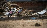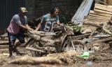 Sejumlah warga memindahkan barang-barang dari puing rumahnya yang hancur akibat banjir bandang di Adonara Timur, Kabupaten Flores Timur, Nusa Tenggara Timur (NTT), Rabu (7/4/2021). Warga korban banjir bandang dan tanah longsor di Flores Timur mengeluhkan minimnya alat berat dan alat bantu lainnya untuk membersihkan puing bangunan, batu, dan lumpur. (FOTO : ADITYA PRADANA PUTRA/ANTARA )