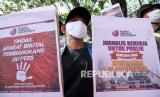 Jurnalis memegang poster saat aksi solidaritas di Lhokseumawe, Aceh, Kamis (8/4/2021). Aksi oleh Alinasi Jurnalis Independen (AJI) dan Persatuan Wartawan Aceh (PWA) itu menuntut Kapolri mengusut tuntas oknum pelaku kekerasan terhadap wartawan Tempo Nurhadi dan kasus kekerasan terhadap wartawan lainnya di tanah air. (FOTO : Antara/Rahmad)