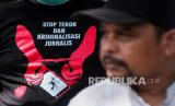 REPUBLIKA.CO.ID, LHOKSEUMAWE -- Seorang jurnalis mengenakan kaos bertuliskan "Stop Teror dan Kriminalisasi Jurnalis" saat aksi solidaritas di Lhokseumawe, Aceh, Kamis (8/4/2021).