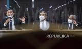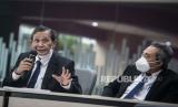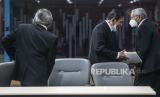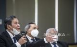REPUBLIKA.CO.ID, JAKARTA -- Ketua Dewan Pengawas KPK Tumpak Hatorangan Panggabean bersama anggota Dewan Pengawas Syamsuddin Haris dan Harjono (kanan) memberikan keterangan pers seusai menyelenggarakan sidang putusan pelanggaran kode etik pegawai KPK di Gedung KPK C1, Jakarta, Kamis (8/4/2021).