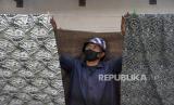 Pekerja menyelesaikan pembuatan kain batik di Rumah Batik Komar, Jalan Cigadung Raya, Kota Bandung, Kamis (8/4). Ketua Asosiasi Pengusaha dan Perajin Batik Indonesia, Komarudin Kudiya mengungkapkan produksi batik di Jawa Barat menurun hingga 70 persen akibat pandemi Covid-19 yang membuat penurunan jumlah pesanan secara signifikan. (FOTO : REPUBLIKA/ABDAN SYAKURA)