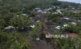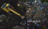 Foto udara pencarian korban hilang dalam bencana tanah longsor di Desa Nelelamadike, Kecamatan Ile Boleng, Kabupaten Flores Timur, Nusa Tenggara Timur (NTT), Kamis (8/4/2021). Hingga hari kelima pascabencana banjir dan tanah longsor di Flores Timur, pencarian korban hilang semakin digencarkan dengan mengerahkan lebih banyak alat berat, jumlah personel tim gabungan, dan anjing pelacak. (FOTO : ADITYA PRADANA PUTRA/ANTARA )
