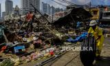 Petugas saat memperbaiki kabel listrik pasca kebakaran di Pasar Kambing, Tanah Abang, Jakarta, Jumat (9/4). Sebanyak 136 lapak dan 40 kios pedagang terbakar yang diduga akibat korsleting listrik dan tidak ada korban jiwa dalam peristiwa tersebut. Selanjutnya, Pemerintah Provinsi DKI Jakarta akan menata ulang pasar tersebut. (FOTO : Republika/Putra M. Akbar)
