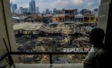 Warga melihat kios dan lapak yang hangus pasca kebakaran di Pasar Kambing, Tanah Abang, Jakarta, Jumat (9/4). Sebanyak 136 lapak dan 40 kios pedagang terbakar yang diduga akibat korsleting listrik dan tidak ada korban jiwa dalam peristiwa tersebut. Selanjutnya, Pemerintah Provinsi DKI Jakarta akan menata ulang pasar tersebut. (FOTO : Republika/Putra M. Akbar)