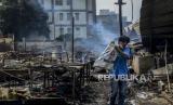 Api yang masih menyala di lokasi pasca kebakaran di Pasar Kambing, Tanah Abang, Jakarta, Jumat (9/4). Sebanyak 136 lapak dan 40 kios pedagang terbakar yang diduga akibat korsleting listrik dan tidak ada korban jiwa dalam peristiwa tersebut. Selanjutnya, Pemerintah Provinsi DKI Jakarta akan menata ulang pasar tersebut. Republika/Putra M. Akbar (FOTO : Republika/Putra M. Akbar)