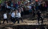Presiden Joko Widodo (bawah, ketiga kiri) meninjau lokasi tanah longsor di Desa Nelelamadike, Ile Boleng, Kabupaten Flores Timur, Nusa Tenggara Timur (NTT), Jumat (9/4/2021). Tinjauan tersebut untuk memastikan penanganan pascabencana di lokasi tersebut dapat berjalan dengan baik. (FOTO : Antara/Aditya Pradana Putra)