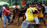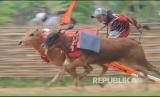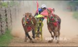 REPUBLIKA.CO.ID, PAMEKASAN -- Joki memacu sapi kerapan saat kejuaraan kerapan sapi se Madura di Desa Mortajih, Pamekasan, Jawa Timur, Jumat, Sabtu (10/4/2021).