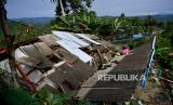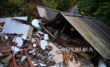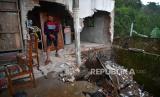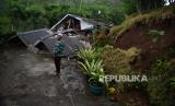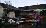 Warga melihat kondisi rumahnya yang rubuh akibat gempa di Desa Kali Uling, Lumajang, Jawa Timur, Ahad (11/4/2021). Sekitar ratusan rumah warga di wilayah itu rusak akibat gempa bermagnitudo 6,1 SR yang terjadi di Kabupaten Malang pada Sabtu (10/4). (FOTO : ANTARA /Zabur Karuru)