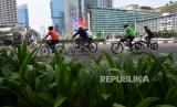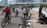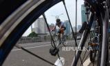 REPUBLIKA.CO.ID, JAKARTA -- Pesepeda berolahraga di kawasan Kuningan, Jakarta, Minggu (11/4/2021). Kepala Dinas Perhubungan (Dishub) DKI Jakarta Syafrin Liputo menyebut adanya peningkatan pengguna jalur sepeda pada setiap akhir pekan, yakni pada hari kerja sebanyak 3.000 pengguna sedangkan pada akhir pekan mencapai 12.000 hingga 30.000 pengguna jalur sepeda.