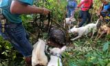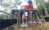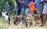REPUBLIKA.CO.ID, MUAROJAMBI -- Peserta olahraga berburu babi mengawasi anjing peliharaannya yang bertarung melawan seekor babi, di Nyogan, Muarojambi, Jambi, Minggu (11/4). Kegiatan mingguan yang diinisiasi forum olahraga berburu babi (FORBI) setempat dan diikuti puluhan peserta tersebut bertujuan mengurangi populasi hama babi yang merusak kawasan perkebunan.