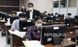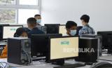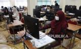 Peserta mengikuti Ujian Tulis Berbasis Komputer (UTBK) jalur Seleksi Bersama Masuk Perguruan Tinggi Nasional (SBMPTN) di Universitas Syiah Kuala, Banda Aceh, Aceh, Senin (12/4/2021). UTBK jalur SBMPTN yang diikuti sekitar 8.900 peserta berlangsung hingga 16 April itu digelar dengan penerapan protokol kesehatan secara ketat guna mencegah penyebaran COVID-19. (FOTO : ANTARA/Ampelsa)