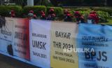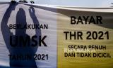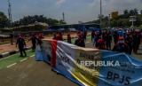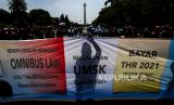 Sejumlah massa buruh dari Konfederasi Serikat Pekerja Indonesia (KSPI) melaksanakan aksi di kawasan Patung Kuda, Jakarta, Senin (12/4). Pada aksi tersebut mereka menutut pembayaran Tunjangan Hari Raya (THR) 2021 secara penuh, meminta Mahkamah Konstitusi membatalkan Omnibus Law, pemberlakuan upah minimum sektoral kabupaten/kota (UMSK) untuk tahun ini dan mendesak Kejaksaan Agung mengusut dugaan korupsi BPJS Ketenagakerjaan. (FOTO : Republika/Putra M. Akbar)