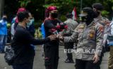 Polisi memberikan minuman untuk massa buruh yang melaksanakan aksi di kawasan Patung Kuda, Jakarta, Senin (12/4). Pada aksi tersebut mereka menutut pembayaran Tunjangan Hari Raya (THR) 2021 secara penuh, meminta Mahkamah Konstitusi membatalkan Omnibus Law, pemberlakuan upah minimum sektoral kabupaten/kota (UMSK) untuk tahun ini dan mendesak Kejaksaan Agung mengusut dugaan korupsi BPJS Ketenagakerjaan. (FOTO : Republika/Putra M. Akbar)