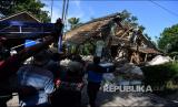 Relawan dan warga berusaha merubuhkan sebuah rumah yang rusak akibat gempa di Desa Kaliuling, Lumajang, Jawa Timur, Senin (12/4/2021). Warga mulai merubuhkan bangunannya yang rusak akibat gempa yang terjadi pada Sabtu (10/4) untuk mengantisipasi jatuhnya reruntuhan pascagempa. (FOTO : Antara/Zabur Karuru)