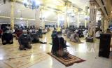 Jamaah menunaikan shalat tarawih di Masjid Gede Kauman, Yogyakarta, Senin (12/4). Masjid Gede Kauman kembali menyelenggarakan shalat tarawih berjamaah pada Ramadhan 1442 H. Namun jamaah dibatasi hanya untuk warga sekitar masjid dan menerapkan protokol kesehatan Covid-19 ketat. (FOTO : Wihdan Hidayat / Republika)