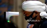 Jamaah memgukur suhu tubuh sebelum memasuki Masjid Gede Kauman, Yogyakarta, Senin (12/4). Masjid Gede Kauman kembali menyelenggarakan shalat tarawih berjamaah pada Ramadhan 1442 H. Namun jamaah dibatasi hanya untuk warga sekitar masjid dan menerapkan protokol kesehatan Covid-19 ketat. (FOTO : Wihdan Hidayat / Republika)
