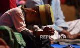 Seorang anak melaksanakan shalat tarawih pertama di Desa Kaliuling, Lumajang, Jawa Timur, Senin (12/4/2021). Shalat tarawih tersebut dilaksanakan di tenda darurat yang dibangun warga di halaman rumahnya yang rusak akibat gempa pada Sabtu (10/4). (FOTO : Antara/Zabur Karuru)