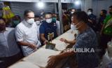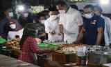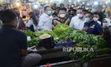 Menteri Perdagangan (Mendag) Muhammad Lutfi dan Gubernur Jawa Barat M Ridwan Kamil berbincang dengan pedagang saat meninjau harga kebutuhan pokok di Pasar Kosambi, Kota Bandung, Selasa (13/4). Mendag akan melakukan pemantauan terhadap sejumlah komuditas kebutuhan pokok selama Ramadhan agar tetap terjaga stoknya dan stabil hargannya. (FOTO : Edi Yusuf/Republika)