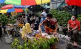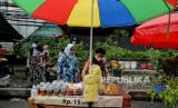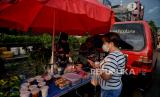 Pedagang menunggu pembeli di Pasar Takjil Benhil, Jakarta, Selasa (13/4). Pada hari pertama puasa, Pasar Takjil Benhil mulai dipadati sejumlah pedagang dengan tetap menerapkan protokol kesehatan diantaranya menyediakan handsanitizer, menggunakan masker serta pengaturan jarak fisik antar pedagang, hal ini dilakukan sebagai upaya mengantisipasi penyebaran covid-19. Republika/Thoudy Badai (FOTO : Republika/Thoudy Badai)