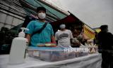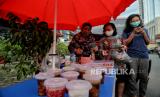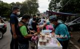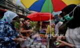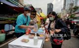 Warga membeli takjil dan makanan untuk berbuka puasa di Pasar Takjil Benhil, Jakarta, Selasa (13/4). Pada hari pertama puasa, Pasar Takjil Benhil mulai dipadati sejumlah pedagang dengan tetap menerapkan protokol kesehatan diantaranya menyediakan handsanitizer, menggunakan masker serta pengaturan jarak fisik antar pedagang, hal ini dilakukan sebagai upaya mengantisipasi penyebaran covid-19. (FOTO : Republika/Thoudy Badai)