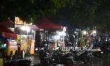 Pedagang berjejer menunggu warga yang ngabuburit di Alun-alun Selatan, Yogyakarta, Rabu (14/4). Suasana warga yang menunggu berbuka puasa atau ngabuburit terlihat sepi imbas hujan pada sore hari. Biasanya Alun-alun Selatan menjadi salah satu favorit warga untuk ngabuburit. (FOTO : Wihdan Hidayat / Republika)