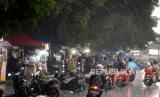Pedagang menggunakan jas hujan menunggu warga yang ngabuburit di Alun-alun Selatan, Yogyakarta, Rabu (14/4). Suasana warga yang menunggu berbuka puasa atau ngabuburit terlihat sepi imbas hujan pada sore hari. Biasanya Alun-alun Selatan menjadi salah satu favorit warga untuk ngabuburit. (FOTO : Wihdan Hidayat / Republika)