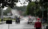 Warga menyemprot disinfektan sebelum warga ngabuburit di Alun-alun Selatan, Yogyakarta, Rabu (14/4). Suasana warga yang menunggu berbuka puasa atau ngabuburit terlihat sepi imbas hujan pada sore hari. Biasanya Alun-alun Selatan menjadi salah satu favorit warga untuk ngabuburit. (FOTO : Wihdan Hidayat / Republika)