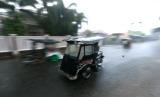 Pengemudi becak motor (bentor) menerjang hujan deras yang mengguyur Kota Gorontalo, Gorontalo, Kamis (15/4). Pemerintah Provinsi Gorotalo mengimbau warga untuk mengantisipasi potensi terjadinya badai Siklon Tropis Surigae yang menurut prediksi BMKG dapat menyebabkan gelombang tinggi mencapai satu hingga dua meter di perairan utara Gorontalo, serta potensi hujan lebat di sejumlah wilayah. (FOTO : ANTARA/Adiwinata Solihin)