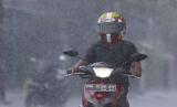 Seorang pengendara motor menerjang hujan deras yang mengguyur Kota Gorontalo, Gorontalo, Kamis (15/4). Pemerintah Provinsi Gorotalo mengimbau warga untuk mengantisipasi potensi terjadinya badai Siklon Tropis Surigae yang menurut prediksi BMKG dapat menyebabkan gelombang tinggi mencapai satu hingga dua meter di perairan utara Gorontalo, serta potensi hujan lebat di sejumlah wilayah. (FOTO : ANTARA/Adiwinata Solihin)