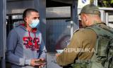 Tentara Israel memeriksa identitas warga Palestina di pos pemeriksaan Israel untuk bisa menjalankan shalat jumat di Kompleks Masjid Al Aqsa, Palestina, Jumat (16/4). (FOTO : REUTERS/Mussa Qawasma)