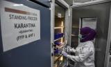 Petugas memeriksa kantong darah di Kantor PMI Kota Bandung, Jalan Aceh, Kota Bandung, Jumat (16/4). Palang Merah Indonesia (PMI) Kota Bandung menyatakan, saat ini stok darah sementara di tempat tersebut menipis dengan total 19 kantong darah jenis packedredcell (PRC) dan 16 kantong darah jenis trombocyt (TC) akibat meningkatnya permintaan dan menurunnya pendonor darah pada bulan Ramadhan dan pandemi Covid-19. Foto: Republika/Abdan Syakura (FOTO : REPUBLIKA/ABDAN SYAKURA)