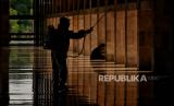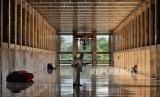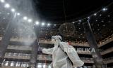 Petugas Palang Merah Indonesia (PMI) menyemprotkan cairan disinfektan di area tempat ibadah Masjid Istiqlal, Jakarta, Jumat (16/4). Penyemprotan tersebut dilakukan secara berkala di area masjid istiqlal saat bulan suci Ramadhan hingga Hari Raya Idul Fitri guna mengantisipasi penyebaran covid-19. (FOTO : Republika/Thoudy Badai)