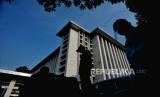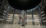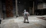 Petugas Palang Merah Indonesia (PMI) menyemprotkan cairan disinfektan di area tempat ibadah Masjid Istiqlal, Jakarta, Jumat (16/4). (FOTO : Republika/Thoudy Badai)
