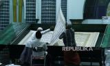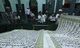 REPUBLIKA.CO.ID, BANYUWANGI -- Umat Islam bertadarus menggunakan Al Quran raksasa di Masjid Baiturrahman, Banyuwangi, Jawa Timur, Jumat (16/4/2021). Al Quran raksasa berukuran 142 x 210 centimeter hasil tulisan tangan H Abdul Karim tersebut dibaca setiap bulan Ramadhan di Masjid Baiturrahman Banyuwangi.