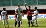 Wasit Iwan Sukoco memberikan kartu kuning untuk bek PSS Mario Maslac saat melawan Persib pada pertandingan Semifinal Pertama Piala Menpora 2021 di Stadion Maguwoharjo, Sleman, Yogyakarta, Jumat (16/4) malam. Pada pertandingan Semifinal pertama ini Persib berhasil mengalahkan PSS 2-1. (FOTO : Wihdan Hidayat / Republika)