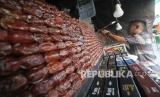 Pedagang menata kurma dagangannya di salah satu stan di kawasan wisata religi makam dan masjid Sunan Ampel, Surabaya, Jawa Timur, Jumat (16/4/2021). Menurut pedagang, penjualan kurma yang dibanderol mulai harga Rp20.0000 hingga Rp650.000 per kilogram tergantung jenisnya tersebut meningkat hingga dua kali lipat dibanding hari biasanya. (FOTO : Antara/Moch Asim)