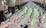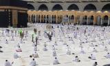 Jamaah umrah menjalankan Shalat Jumat dengan menjaga jarak fisik di Masjidil Haram, Makkah, Arab Saudi (16/4) waktu setempat. (FOTO : REUTERS/STRINGER)