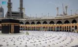 Jamaah umrah menjalankan Shalat Jumat dengan menjaga jarak fisik di Masjidil Haram, Makkah, Arab Saudi (16/4) waktu setempat. (FOTO : REUTERS/Saudi Press Agency)