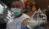 Seorang pria menerima suntikan vaksin COVID-19 Sinovac selama vaksinasi massal di Jakarta, Indonesia. Kamis, 15 April 2021. (FOTO : AP/Achmad Ibrahim)