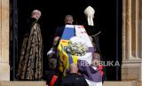 Peti jenazah Pangeran Philip dibawa ke dalam kapel pada prosesi pemakaman Duke of Edinburgh, di Kapel St George yang berada di area Istana Windsor, Inggris, Sabtu (17/4). (FOTO : REUTERS POOL)