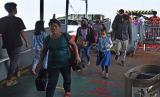 REPUBLIKA.CO.ID, MERAK -- Calon penumpang kapal tujuan Sumatera melintas di Dermaga II Pelabuhan Merak, Banten, Ahad (18/4/2021).