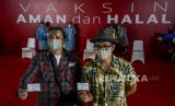 Pelawak Arie Kriting bersama istri saat disuntik vaksin Covid-19 dosis pertama di Galeri Nasional, Jakarta, Senin (19/4). Sebanyak 500 seniman dan budayawan menjalani vaksinasi Covid-19 pada hari ini yang diharapkan dapat membangkitkan industri ekonomi kreatif. (FOTO : Republika/Putra M. Akbar)