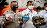 Kabid Humas Polda Metro Jaya Kombes Pol Yusri Yunus (kiri) didampingi Direktur Reserse Narkoba Polda Metro Jaya Kombes Pol Mukti Juharsa (kanan) menunjukkan barang bukti saat memberikan keterangan pers terkait pengungkapan kasus narkoba di Polda Metro Jaya, Jakarta, Senin (19/4/2021). Direktorat Reserse Narkoba Polda Metro Jaya mengamankan sembilan orang tersangka kasus narkoba dengan barang bukti berupa sabu 6.339 gram, ganja 3.000 gram dan 5.385 butir ekstasi. (FOTO : ANTARA/Rivan Awal Lingga)