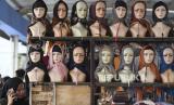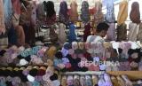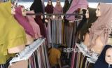 Seorang pedagang menata jilbab yang dijualnya di Jembatan Penyeberangan Multiguna (JPM) Tanah Abang di Jakarta, Senin (19/4/2021). Pedagang mengaku jilbab dengan harga Rp15.000 hingga Rp30.000, penjualannya meningkat hingga 15 potong di bulan Ramadhan dibandingkan bulan sebelumnya. (FOTO : M RISYAL HIDAYAT/ANTARA )
