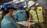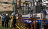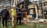 Gubernur Jawa Barat Ridwan Kamil (kedua kanan) melihat proses daur ulang botol plastik saat mengunjungi pabrik PT Namasindo Plas di Batujajar, Kabupaten Bandung Barat, Selasa (20/4). Dalam kesempatan tersebut, Gubernur Jawa Barat Ridwan Kamil bersama Chief Marketing Officer Octopus Hamish Daud Wylie mengunjungi pabrik daur ulang botol plastik Polyethylene Terephthalate (PET) terbesar dan satu-satunya di Asia Tenggara. (FOTO : REPUBLIKA/ABDAN SYAKURA)