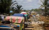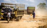 Sejumlah truk antre untuk melintas di Jalan Gubernur Syarkawi, Kabupaten Banjar, Kalimantan Selatan, Selasa (20/4/2021). Pasca bencana alam banjir, ruas jalan nasional yang menghubungkan Kalimantan Selatan dengan Kalimantan Tengah itu masih rusak sehingga berpotensi menghambat distribusi barang di saat meningkatnya kebutuhan masyarakat jelang lebaran. (FOTO : Antara/Bayu Pratama S)