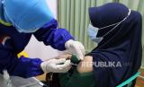 Petugas kesehatan menyuntikkan vaksin COVID-19 Sinovac kepada seorang jemaah calon haji di Dumai, Riau, Selasa (20/4/2021). Sekitar 170 orang calon jemaah haji Dumai mendapatkan vaksinasi COVID-19 Sinovac tahap kedua untuk rencana penyelenggaraan ibadah haji tahun 1442 H/2021 M. (FOTO : Aswaddy Hamid/ANTARA )